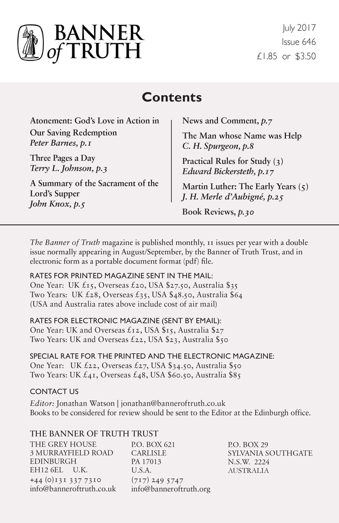 Subscribe to the Banner of Truth Magazine for 11 edifying issues each year (including summer double issue). Table of Contents Common Salvation (1) — Manton, Thomas 1 Pink on The Sovereignty of God — Murray, Iain H 6-17 Direction for the Government of the Tongue according to God’s Word – 3 — Perkins, William 18 […]