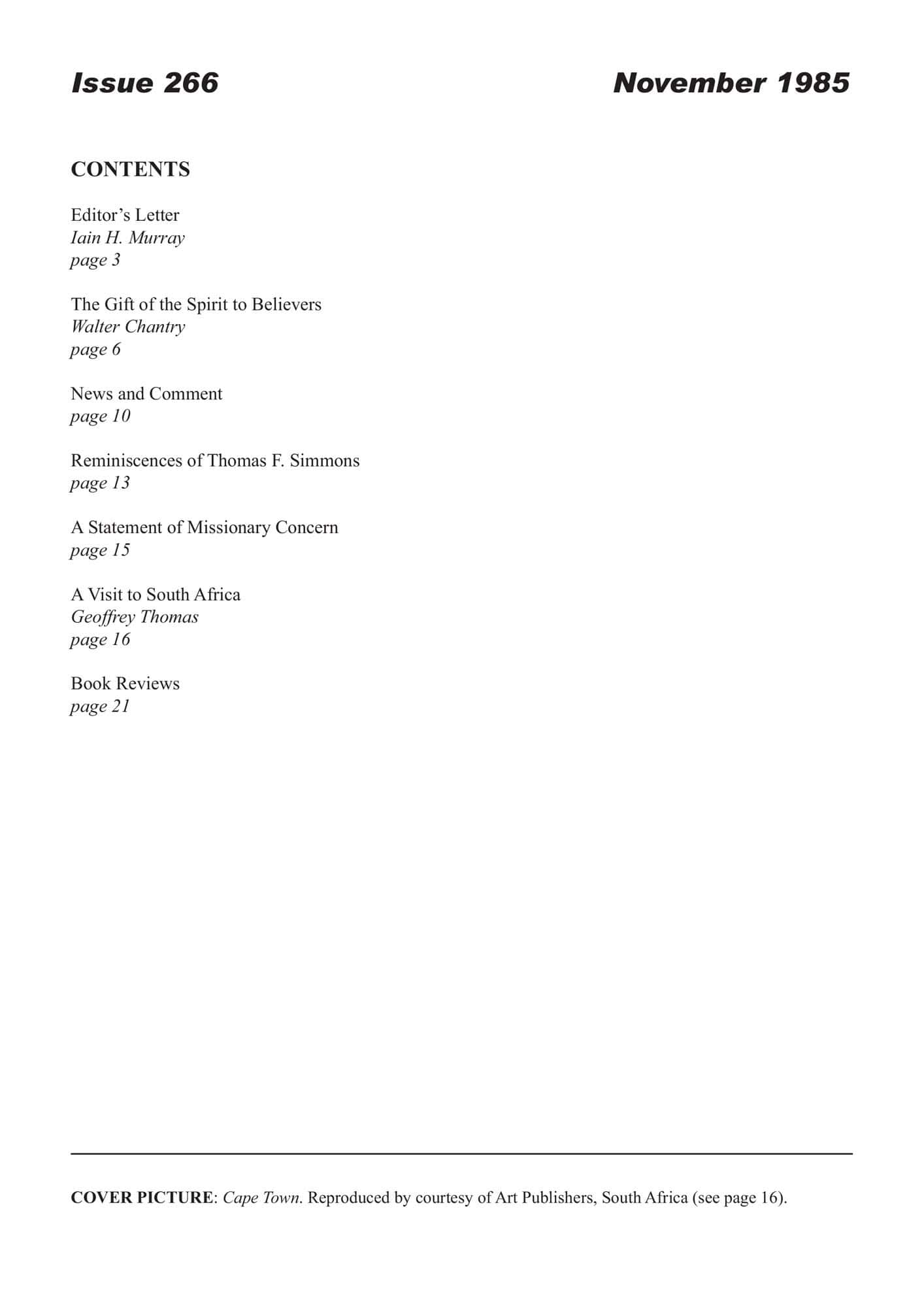 | Visit to South Africa — Thomas, Geoffrey | 20-28 |