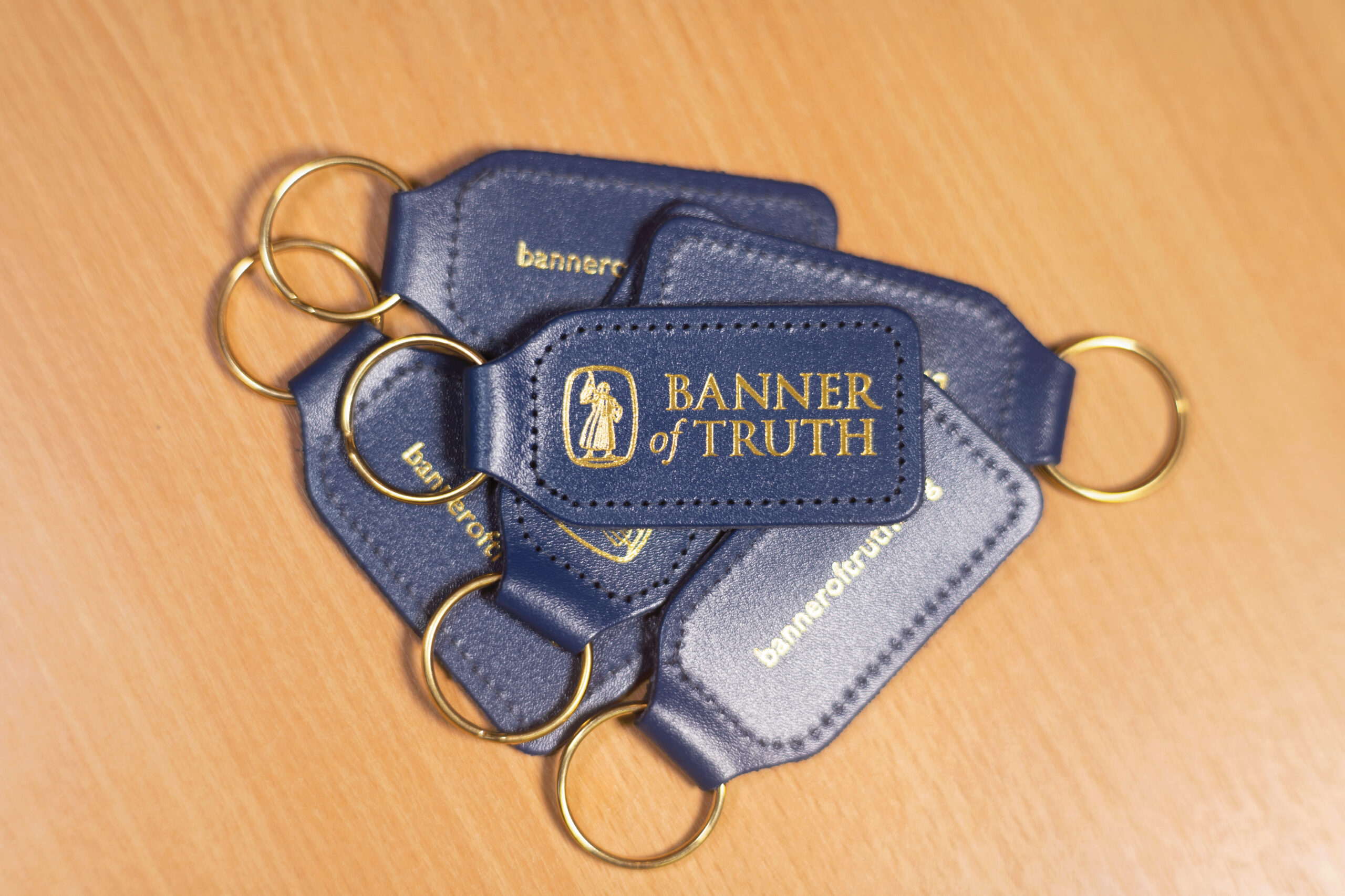This stylish keyring is genuine leather, embossed with the Banner of Truth logo in gold.