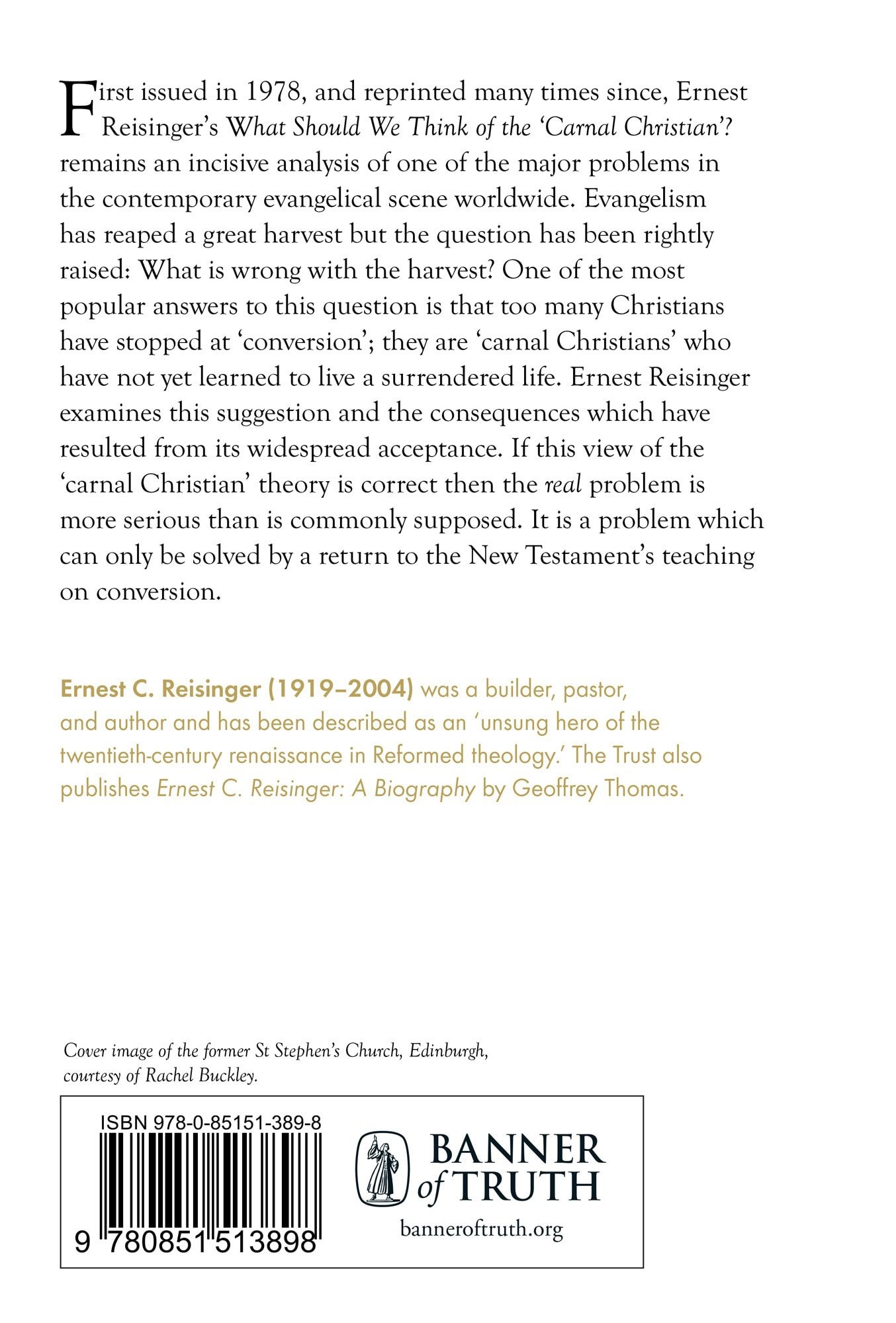 The Carnal Christian’ is an incisive analysis of one of the major problems in the contemporary evangelical scene in the United States. If evangelicals are now 35 or 40 million strong how is it that the life of the nation is so little affected? Evangelism has reaped a great harvest but the question has been rightly raised, what is wrong with the harvest? One of the most popular answers to this question is that too many Christians have stopped at ‘conversion’; they are ‘carnal Christians’ who have not yet learned to live a surrendered life. Ernest Reisinger examines this suggestion and the consequences which have resulted from its widespread acceptance. If this view of the ‘carnal Christian’ theory is correct then the real problem is more serious than is commonly supposed. It is a problem which can only be solved by a return to the New Testament’s teaching on conversion.