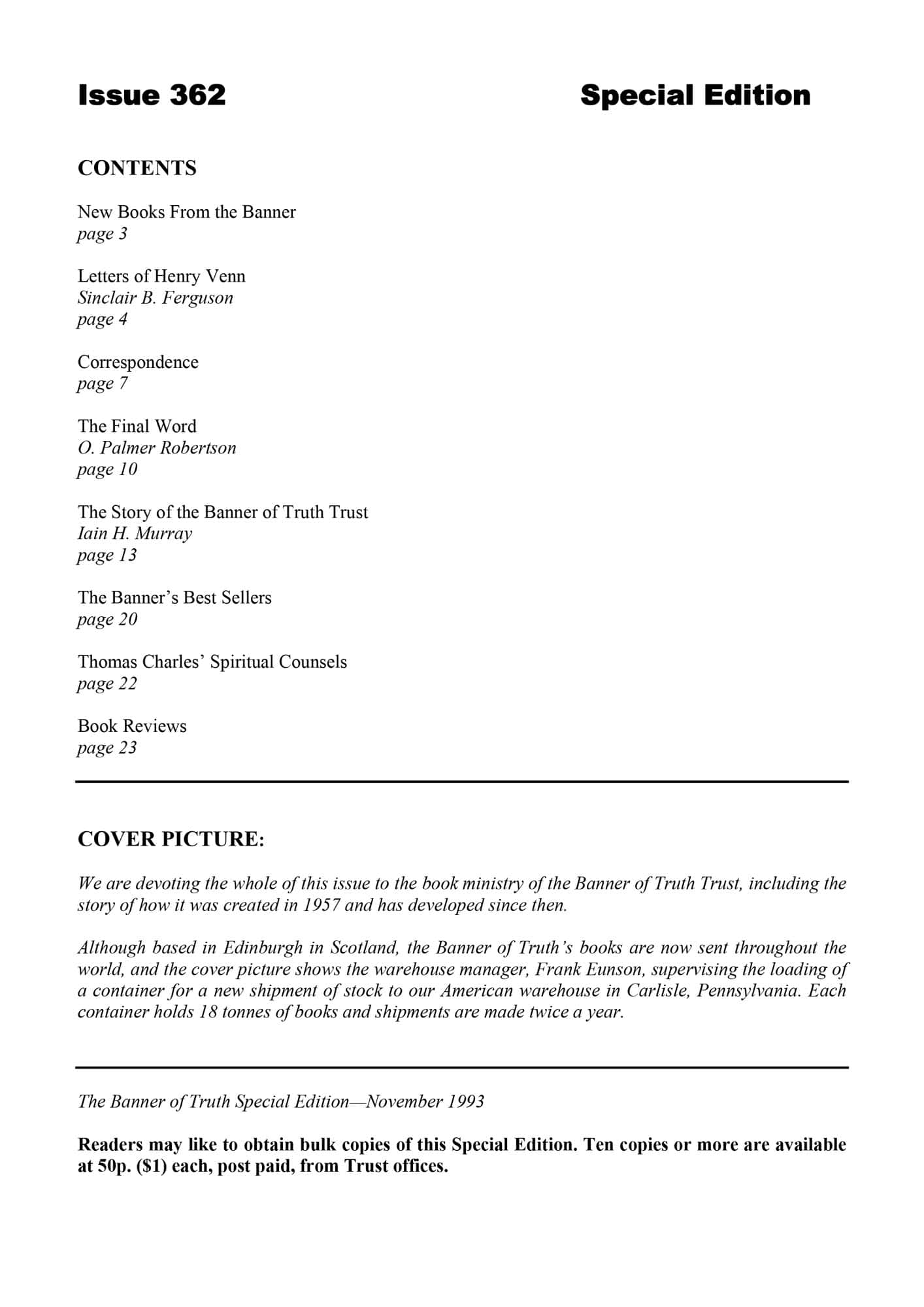 | Story of the Banner of Truth Trust — Murray, Iain H | 15-23 |