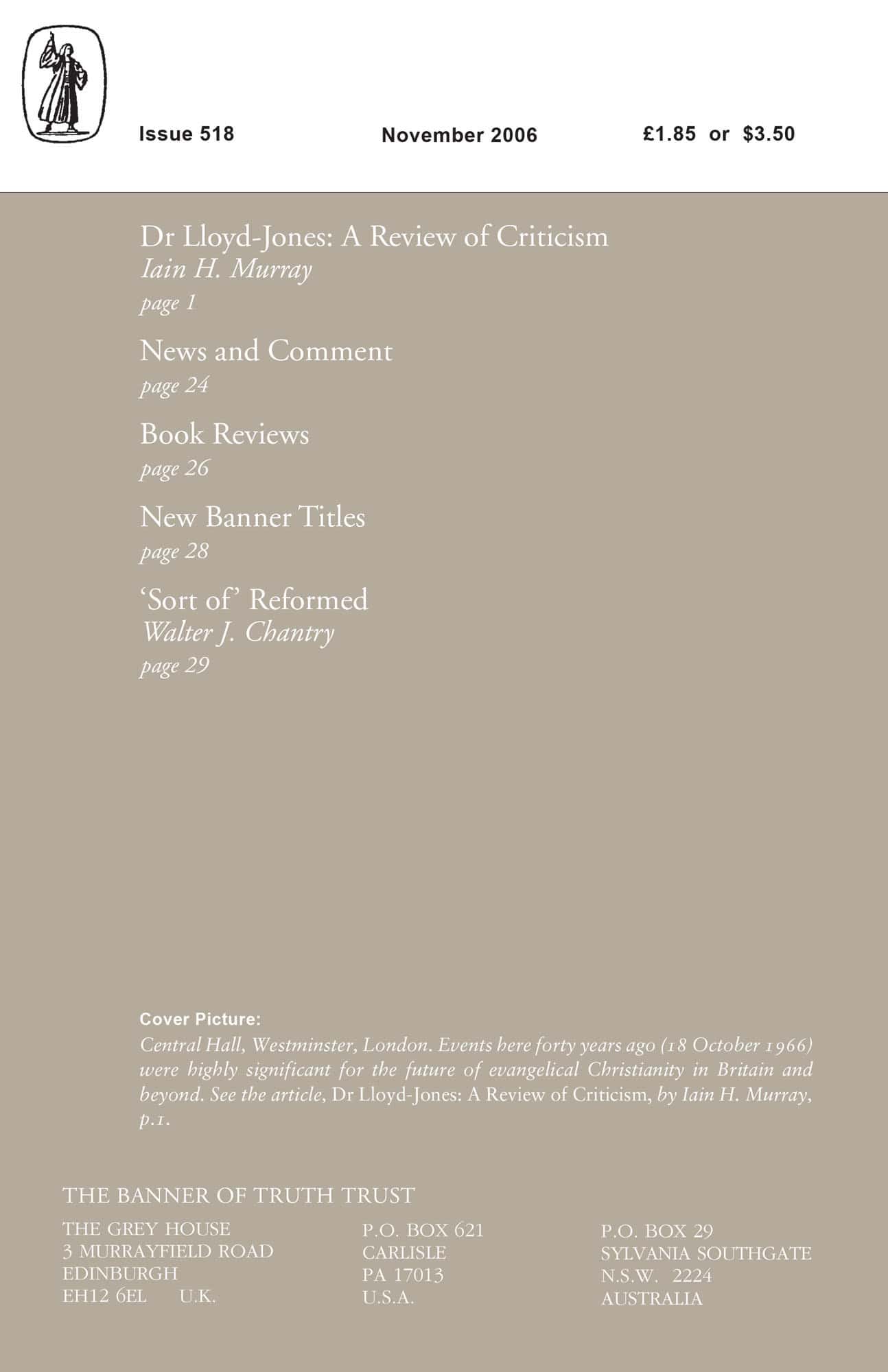 | Dr Lloyd-Jones: A Review of Criticism — Murray, Iain H | 1-23 |