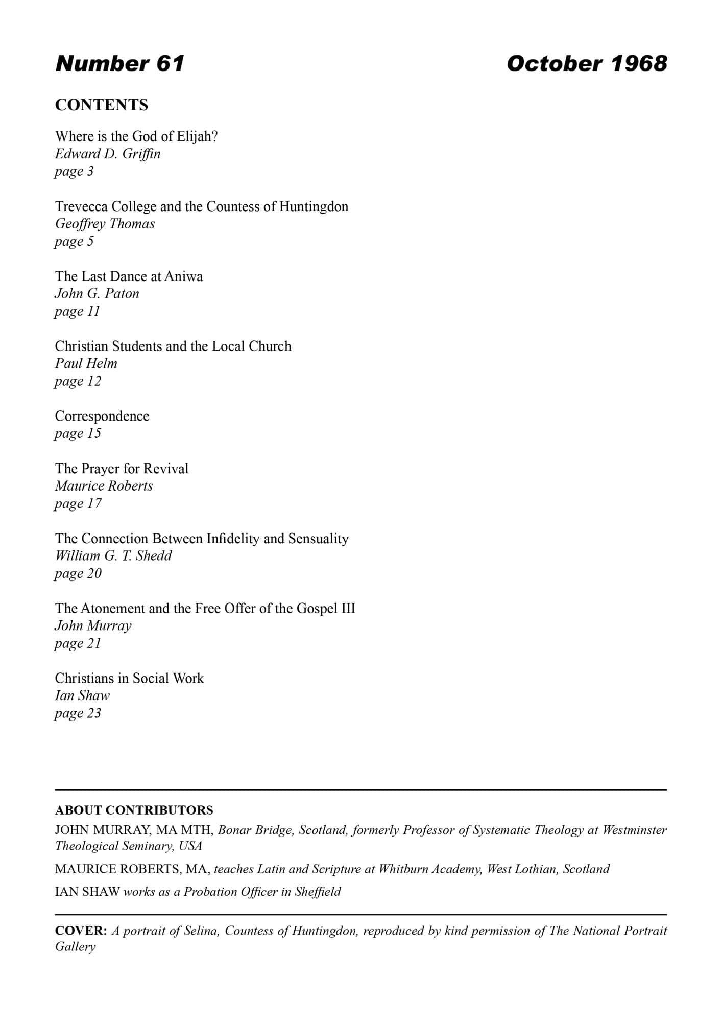 Subscribe to the Banner of Truth Magazine for 11 edifying issues each year (including summer double issue). Table of Contents Prayer: Some Suggestions — Barnes, Peter 1-3 Penitence of Josiah — Chantry, Thomas 6-12 Duty, Benefits and the Proper Method of Religious Fasting — Miller, Samuel 12-34 Response to the Decision of the gereral assembly […]
