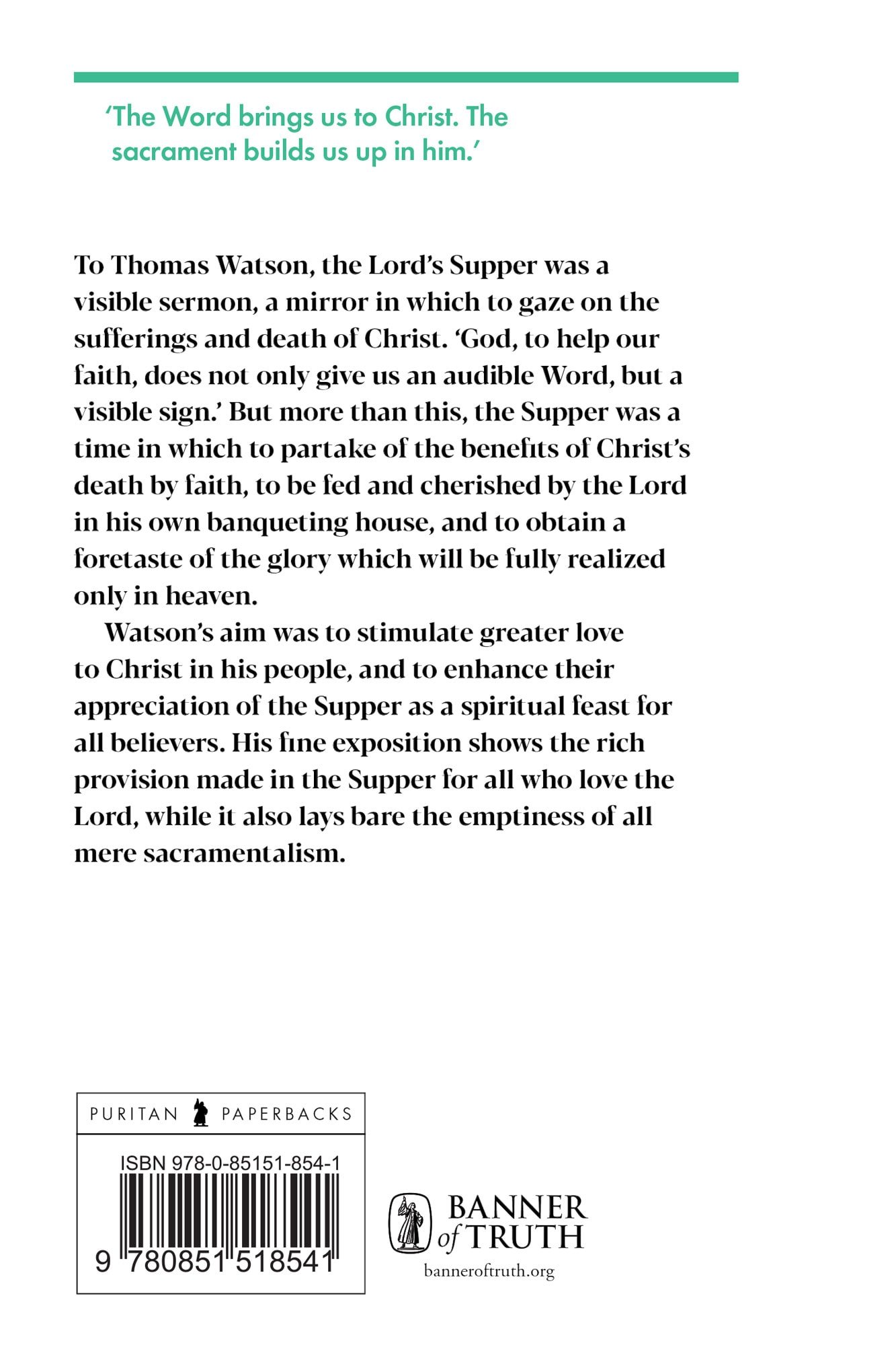 To Thomas Watson, the Lord’s Supper was a visible sermon, a mirror in which to gaze on the sufferings and death of Christ. ‘God, to help our faith, does not only give us an audible Word, but a visible sign.’ But more than this, the Supper was a time in which to partake of the benefits of Christ’s death by faith, to be fed and cherished by the Lord in his own banqueting house, and to obtain a foretaste of the glory which will be fully realized only in heaven. Watson’s aim was to stimulate greater love to Christ in His people, and to enhance their appreciation of the Supper as a spiritual feast for all believers. His fine exposition shows the rich provision made in the Supper for all who love the Lord, while it also lays bare the emptiness of all mere sacramentalism.