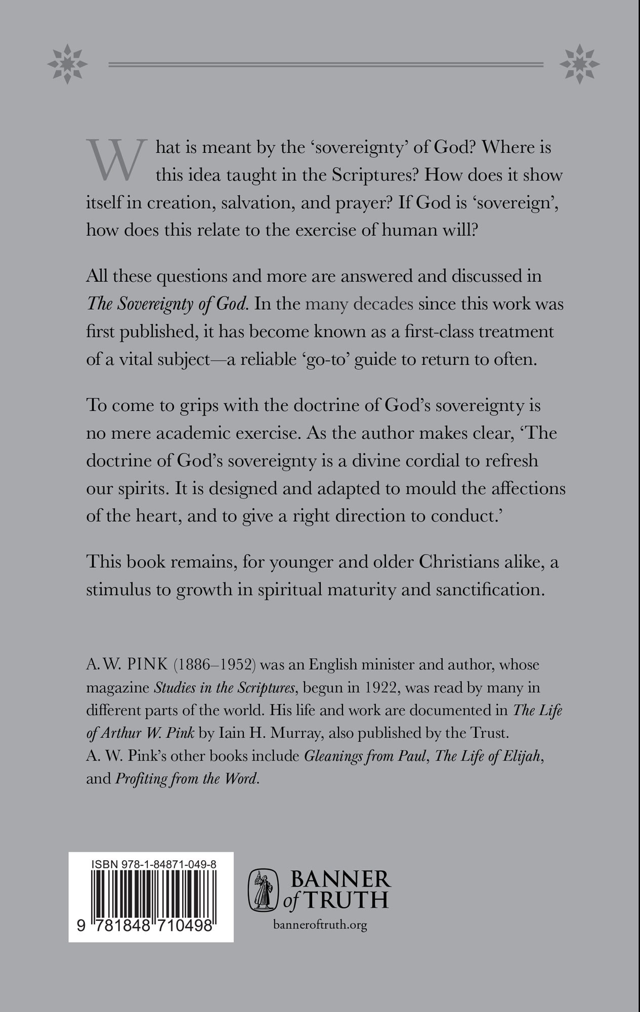 To come to grips with the doctrine of God’s sovereignty is no mere academic exercise. As the author makes clear, ‘The doctrine of God’s sovereignty is a divine cordial to refresh our spirits. It is designed and adapted to mould the affections of the heart, and to give a right direction to conduct.’